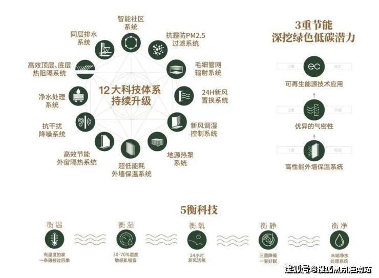 围绕阳光、水、温度、湿度、声音、空气六大环境要素,构建的12大科技系统,带来全面领先于市场的衡温、衡湿、衡氧、衡静、衡净五衡居住体验,打造更适合中国人的健康智慧科技社区。