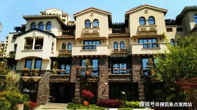 外立面采用文化石和手工打磨的stucco艺术涂料,烟囱、山花、铁艺栏杆、木质葡萄架,配合高低错落的彩瓦屋顶,空间层次优美。