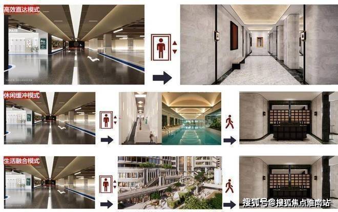 生活融合模式(车库→商场→社区大堂→归家),业主购物餐饮后归家,确保消费便利性与居住私密性并存。