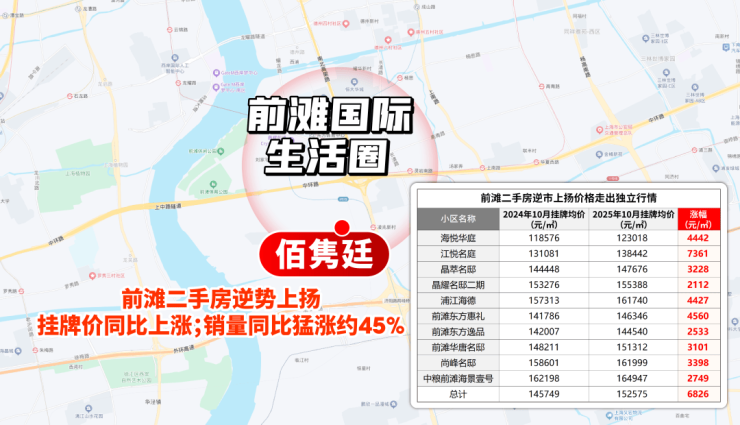 价格上,在约98%板块挂牌价同比下降的当下,前滩多数小区仍保持价格坚挺;销量上,今年1-10月二手房成交约230套,同比大涨约45.6%,印证板块吸引力。