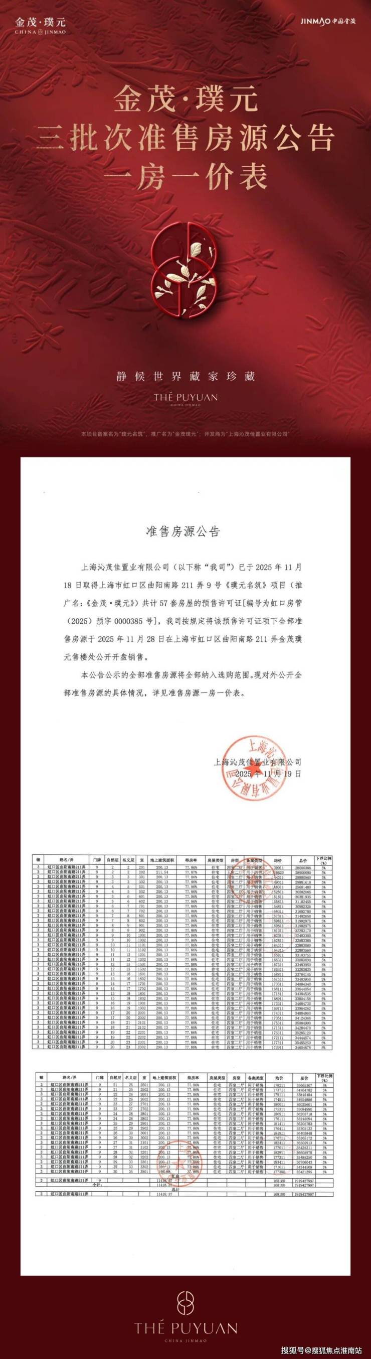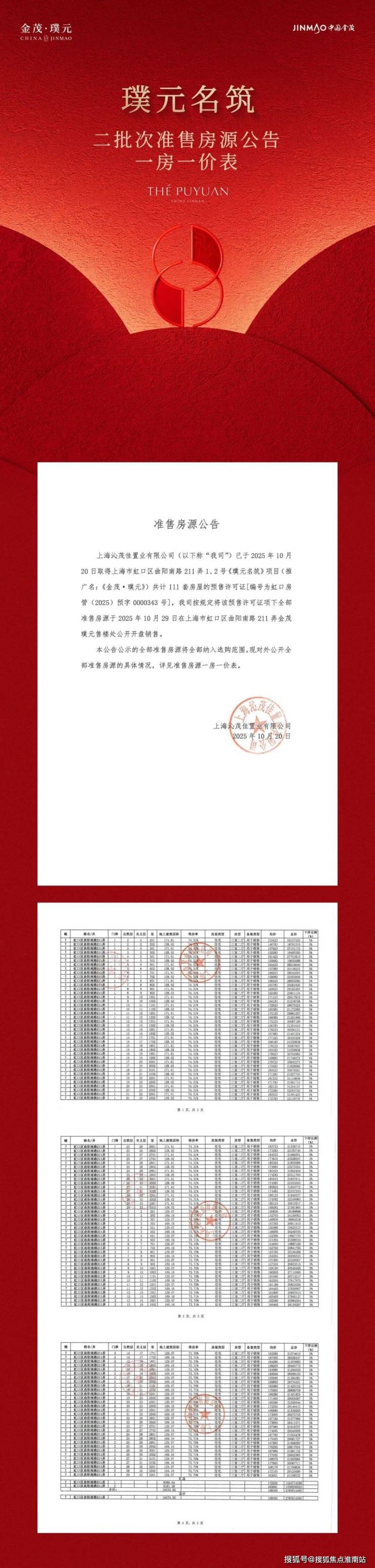 最新消息!上海2025年首个地王“瑞虹地王”金茂+庆隆瑞虹项目正式定名「金茂·璞元」首开售罄!三期建面约200㎡4房;均价16.81万/m²,总价2800-3670万!一梯一户,得房率82-85%,高隐私、空间感强;售楼处线上火热预约中!