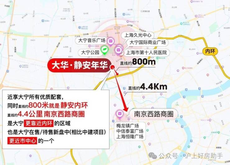 【大华·静安年华】项目可 谓双王炸区位,直线800米贴脸静安内环,一脚油门就能杀进上海城市动脉,畅达全市核心节点;约4.4公里直插静安寺-南京西路心脏,直接把全上海顶流的繁华,变成你家的「日常生活」。