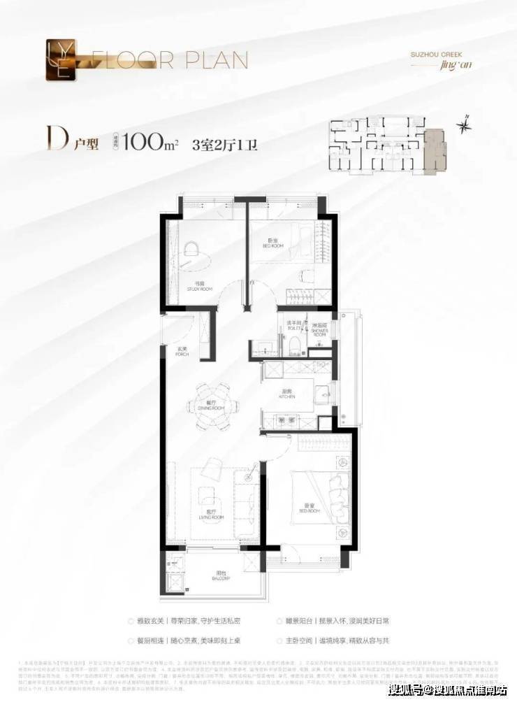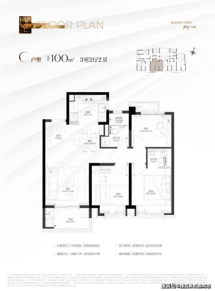 建筑面积约100㎡3房D户型:南北通透的设计让该户型拥有更加优秀的通风效果。而且这个户型做到了全卧飘窗(3个飘窗)+南向瞰景大阳台,丰富的灵动空间提升了实得面积!