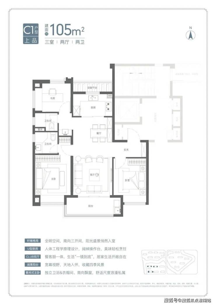 U型厨房、餐厅、客厅、阳台一线联通,南北通透。主卧套房、全卧飘窗、次卫干湿分离也都是标配。