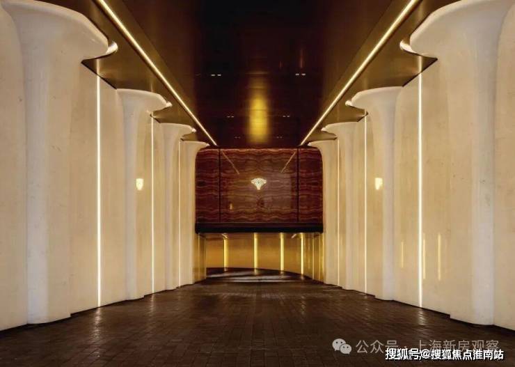 6、 社区含“奢材”量很高。门庭延街的外立面,以精工定制弧形 米色石材为主调,镶嵌典藏级 老虎玉大理石,点缀 古铜色现代海派艺术感灯器,整体呈现出百年海派的贵雅气质。