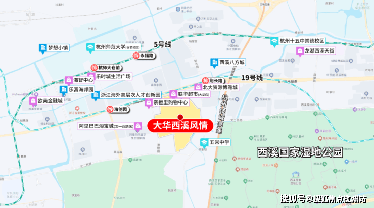 大华西溪风情售楼处地址位置:余杭区文一西路 833 号,未来科技城 1.0 核心,阿里巴巴西溪园区东侧
