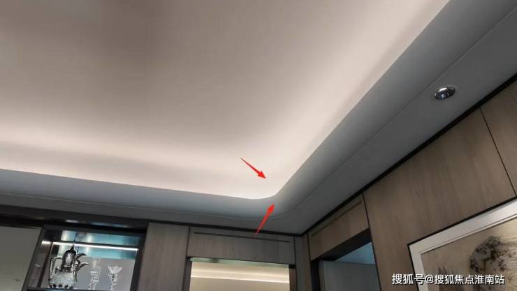比如弧形元素贯穿整个室内空间,多层吊顶内外都做了弧形转角,相比棱角分明的直角边,弧形的几何感不仅能起到柔化空间的效果,也能祛除心理上的疏离感。