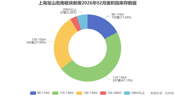 从供应端看,宝山淞南板块新房供应长期断档,上一次主力供应要追溯到2015年的泰禾红御。2026年2月,整个淞南板块新房库存中,建面200㎡以上面积段仅32套,全部来自江湾鸿玺。