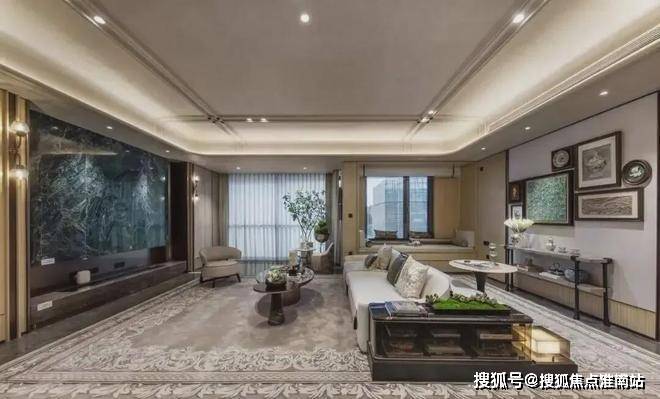 在装饰细节上,从天花板的曲面吊顶、墙体的圆角过渡,到定制家具的流畅线条,都在诉说喜曲不喜平的优雅,天花吊顶,更有刻槽工艺,融入项目logo,赋予业主独一份的尊崇。