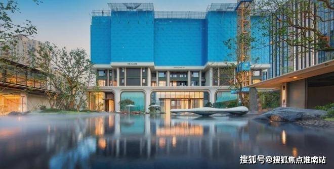 浮光池院水院会客厅,现已实景呈现,水景中央的艺术小品,如一滴水在湖面晕开,泛起阵阵涟漪。
