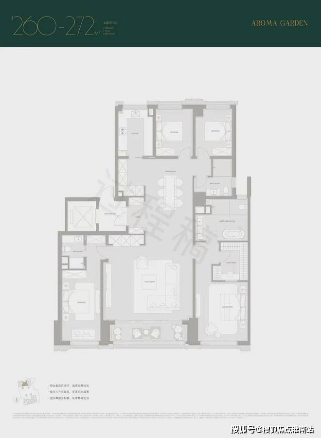 建面约260/272㎡,南向双套房,尤其主卧是豪华套房,带独立衣帽间,卫浴间含双台盆+淋浴+浴缸+马桶四件套。