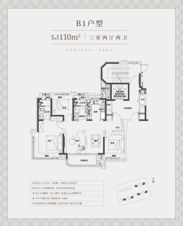 先来看建面约110㎡边套大横厅户型:约12.3米的超宽绰面宽几乎是堪比别墅产品了,这个视野和南向采光面相当出众。