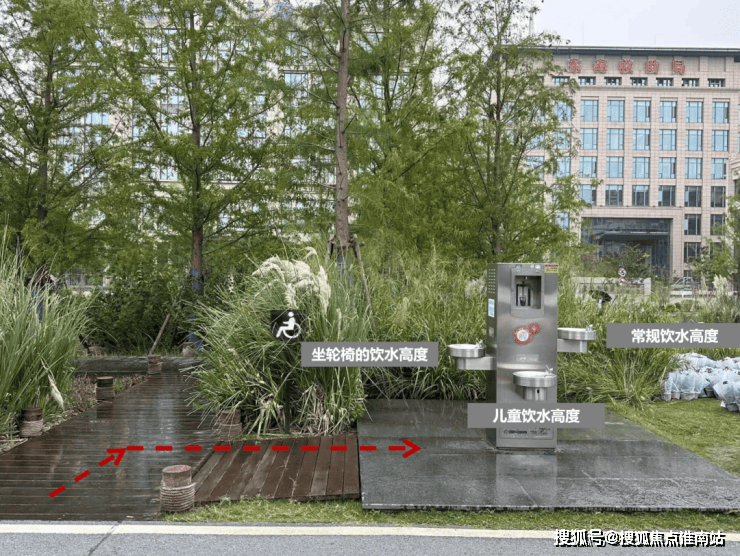 比如,常态了公共直饮水机,这里的设计是先有一条无障碍通道通往,然后针对坐轮椅的人、小朋友以及常规人群做了三个高度的饮水口。