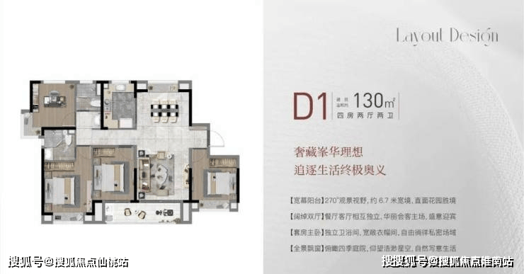 建面约130㎡4房2厅2卫,做到了四开间朝南+南北通透+主卧套房设计+双阳台设计+卫生间干湿分离,“一步到位”大4房,空间尺度非凡。