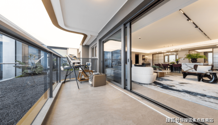 客厅、餐厅、阳台,形成了一个开敞的、连贯的大尺度公共空间。空间的整体性、视野的延伸非常好。中间没有任何横梁,空间足够大,功能性非常丰富。