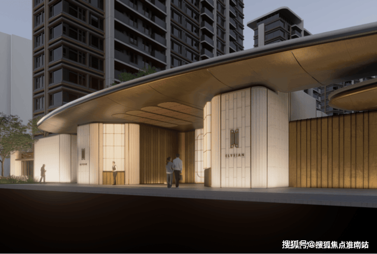 蓝灰色玻璃+仿石铝板+艺术涂料材质,穿插优雅线条,让建筑这张“脸”看起来更高级.One&Only酒店式门头.用雕塑体块、温润弧面和雅致线条,营造具有艺术格调的归家仪式感.