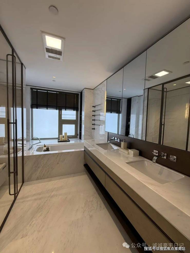 厨卫方面,西厨定制高柜,容纳嘉格纳蒸烤一体机、嘉格纳双开门冰箱、洗手台以及各类收纳空间;中厨自带嘉格纳灶具、油烟机和洗碗机。主卫配置劳芬台盆、浴缸和独立卫浴洁具空间、独立淋浴空间配备当代的花洒,顶部有松下暖风机,还配置了电热毛巾架。