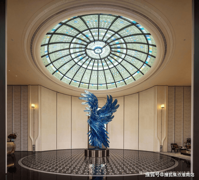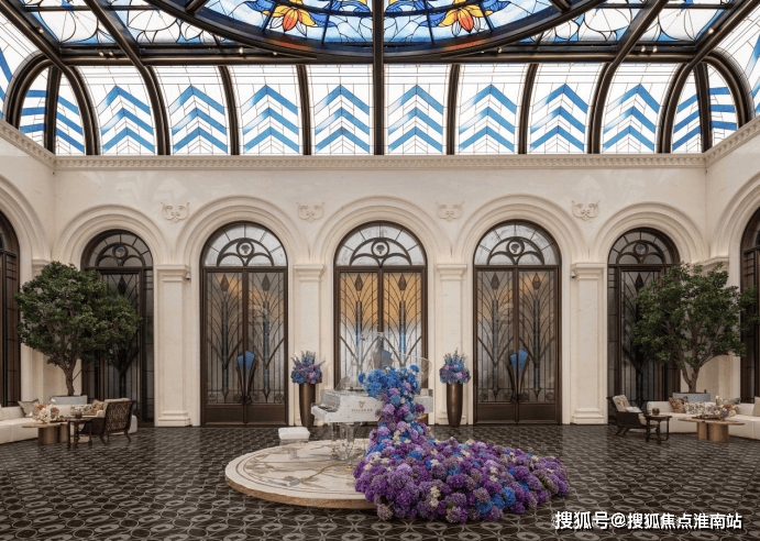 彩绘玻璃穹顶漫射柔和天光,艺术拱门与浮雕墙面交替排列,中央紫蓝渐变花艺装置描摹四季流转之美,可上演私享音乐会、业主演说会、亲子读书会、浪漫下午茶等,复现百年和平饭店的顶层社交场景。