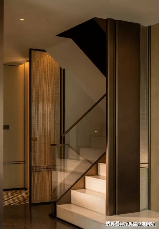 在材质选择上,更凸显低调的隐奢。地上楼梯精选的冬日恋歌大理石与皇家白玉踏步相得益彰(仅限建面约200㎡下叠),帕妮丝灰石材与尼斯木饰面交相辉映。设计师将传统东方元素与现代工艺完美融合,在主卧墙面运用山形暗纹,在地板拼花中融入奢侈品编织美学,打造出独具韵味的品质空间。