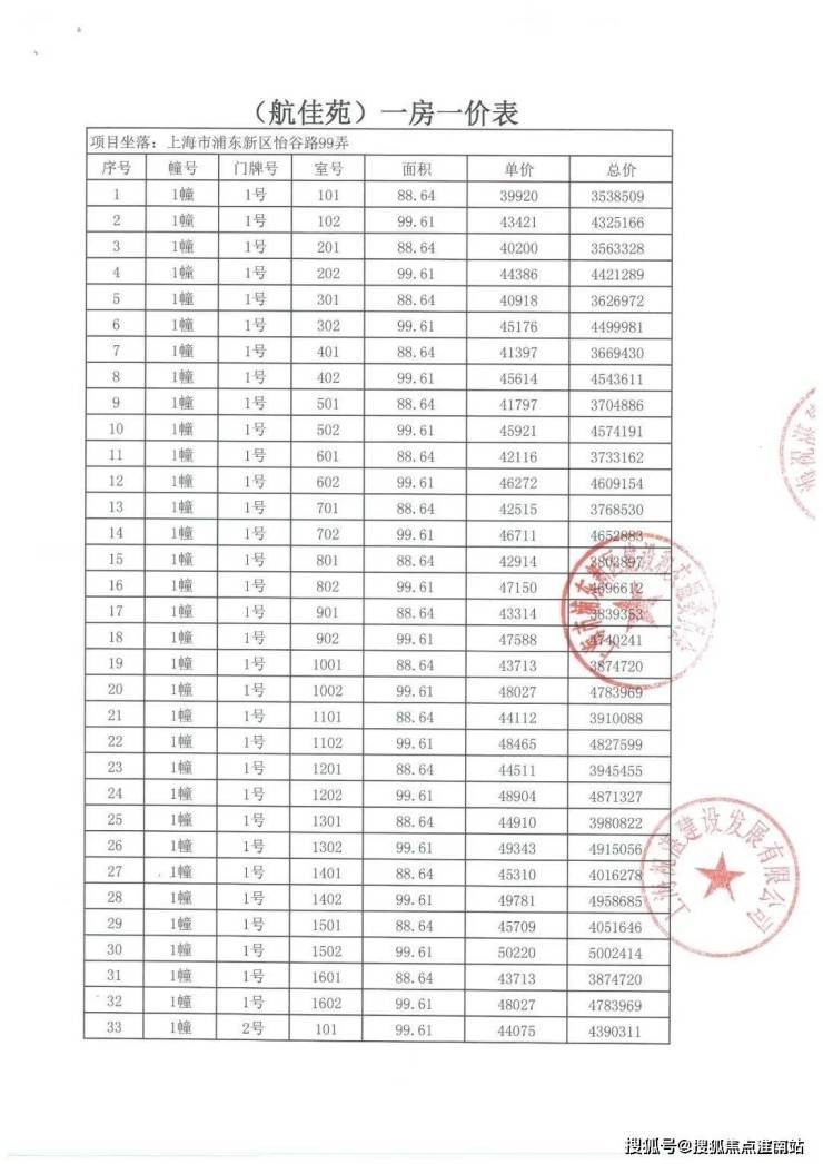 项目一房一价表: