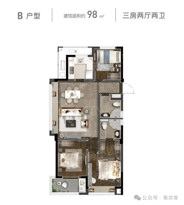 该户型为项目的中间套户型。三开间朝南,采光好!餐客厅一体带南向阳台,晾晒方便,主卧为套房设计带独立卫生间