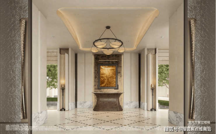 归家八角厅:以法式为底蕴,地面与墙面精选贝金米黄大理石与卡拉白大理石铺陈,纹理如山水画般自然流动。