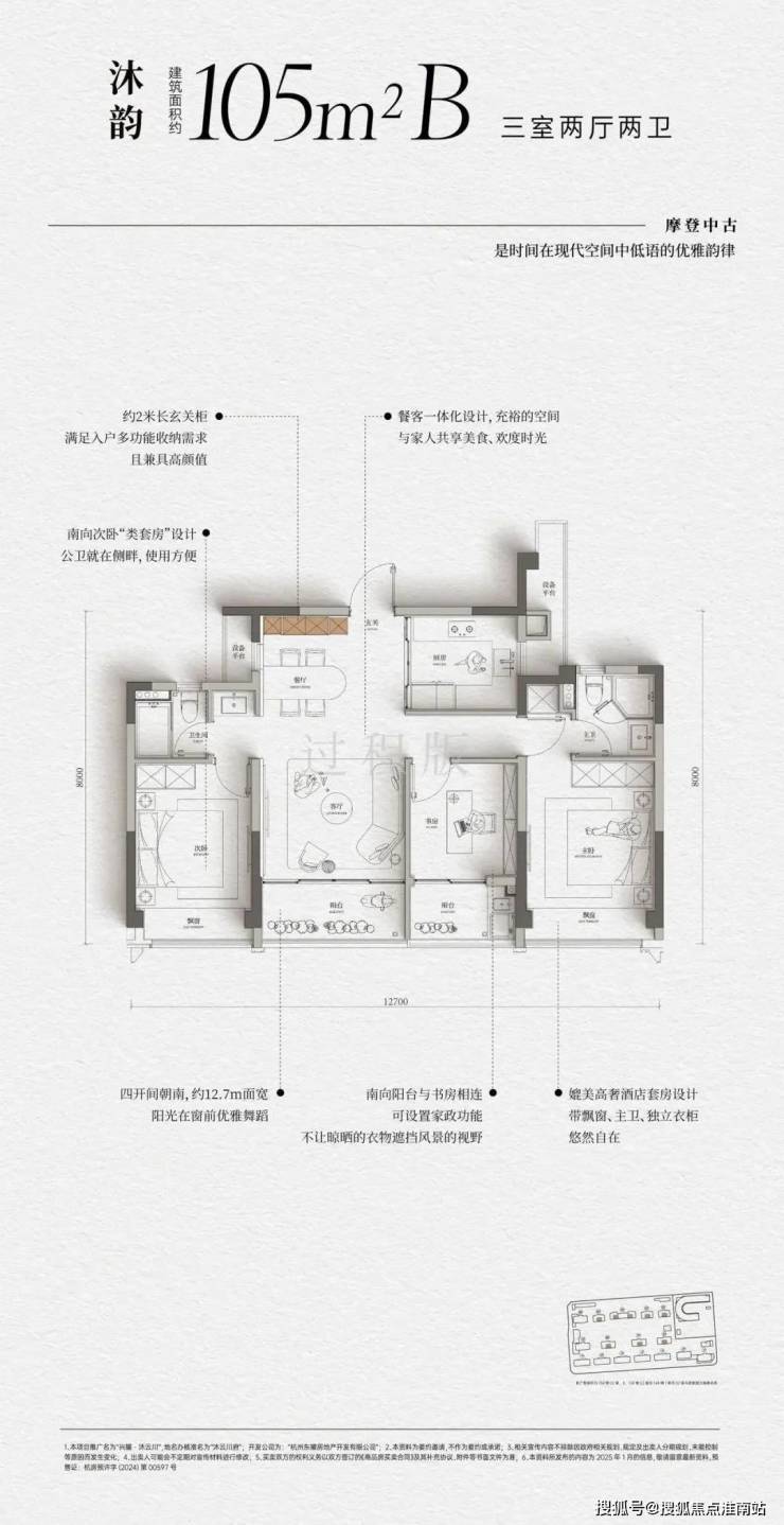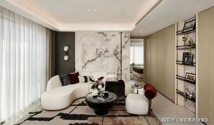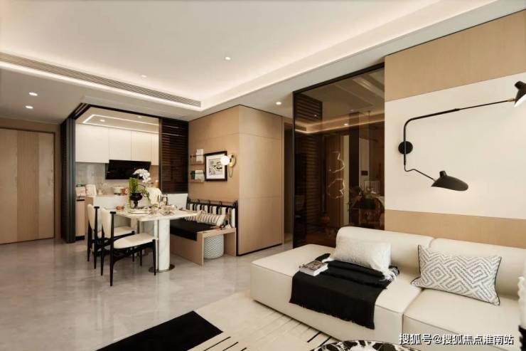 建面约105m²的户型有近6m的纯屏巨幅玻璃,大大提升了采光和观景的需求,“起床就能看到风景”。约5.95m大尺寸的横厅连接超长阳台,做出了奢阔的空间感,形成全家人欢聚的超级大公区。媲美高奢酒店的套房主卧带走入式衣帽间、主卫和飘窗,南次卧带阳台,还是L型玻璃护栏设计,尺度感非常阔绰。