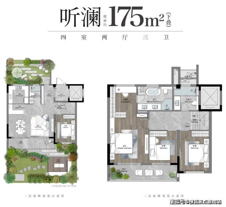 叠墅:有建面约155㎡和175㎡两种户型,三开间朝南。其中,175㎡户型配南北双花园,LDKG一体化巨厅超40㎡。
