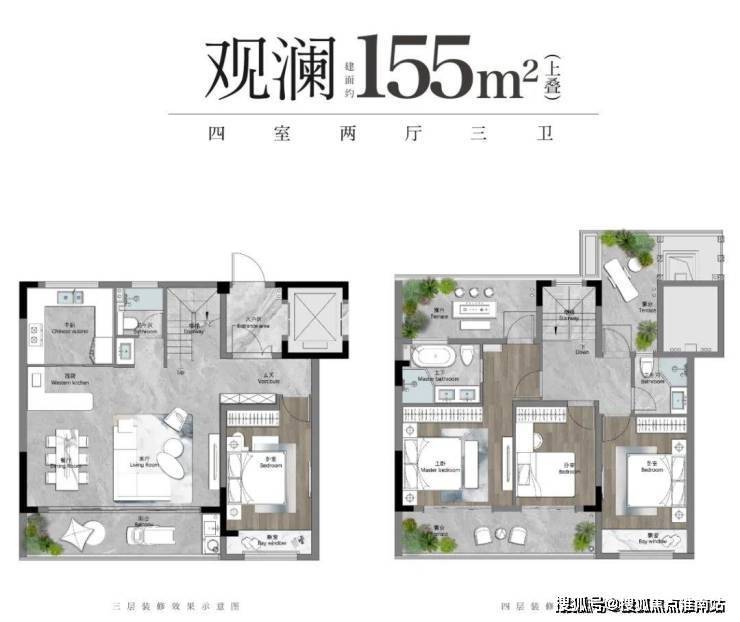 建面约155㎡上叠,南北3露台+顶层星空露台全赠送。