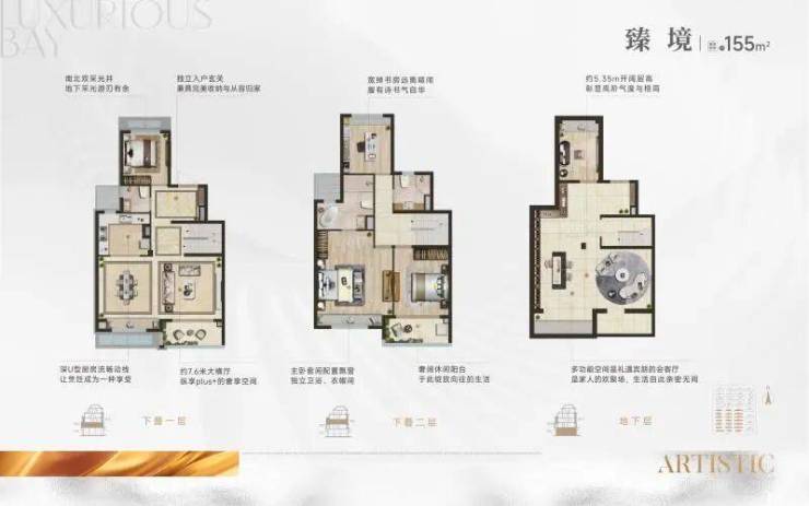 叠墅层高:叠墅1层层高约3.4米,2层层高约3.2米,地下室层高约5.35米