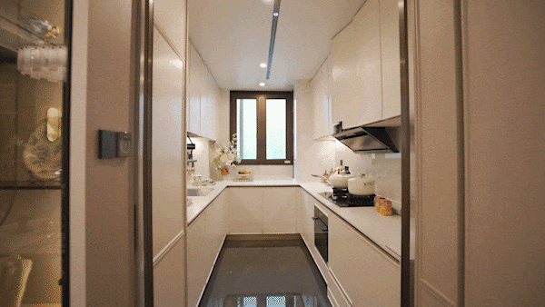 项目整个餐客厅均为 岩板 交付,岩板的尺寸达到了2.4米*1.2米,这是市面上非常罕见的大板配置,即便是市区豪宅,用的大尺寸也不过是1.8米!