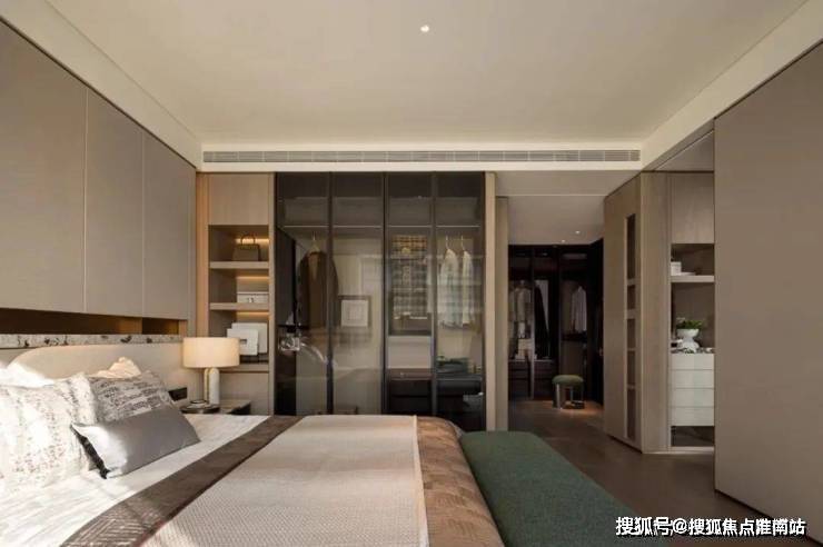 主卧室大气、质感,用简单的造型背景墙和圆形灯就渲染出了卧室的调性,仅用灰色和棕色便提升了空间的精致感。设计师钟爱用线条来映衬出空间的动静感。