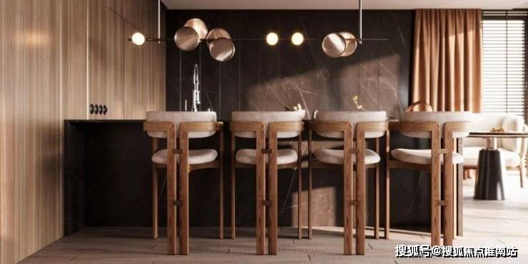 木色的层次充盈了整个空间属性,餐桌的吊灯别具特色,错落有致,与室内的设计格调相呼应,餐凳呈T字形,造型别致的同时又具有实用感。