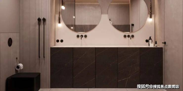 卫生间宽敞而明亮,摈弃过多的射灯或主灯,而是沿用部分照明灯具,立面的装饰线条参差不齐却独有韵味,深色大理石柜体压低了空间的调性,让空间的层次轻重分明。