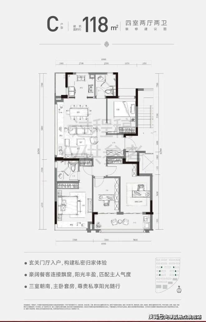 117㎡边套为四室两厅两卫,三开间朝南+南向双开间阳台。在洋房得房率的加持下,套内面积比肩高层建面约130㎡户型。