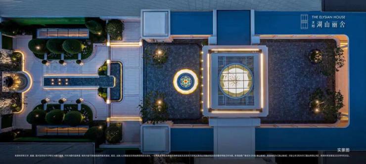 以意式美学植物与对称水景营造秩序感,丹桂树阵融汇东方写意,蓝翡翠奢石串联水系轴线。