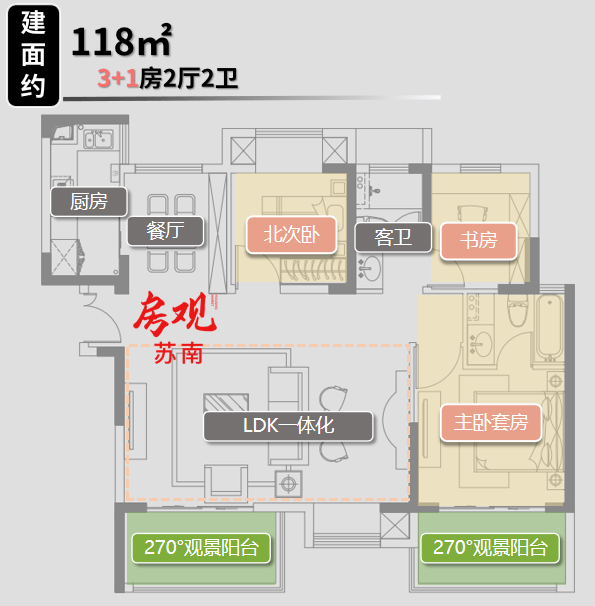 约118㎡户型整个户型LDK一体化开间约6.6m,可作为大3房,双阳台拐角270°采光,也可作为功能性4房使用,
