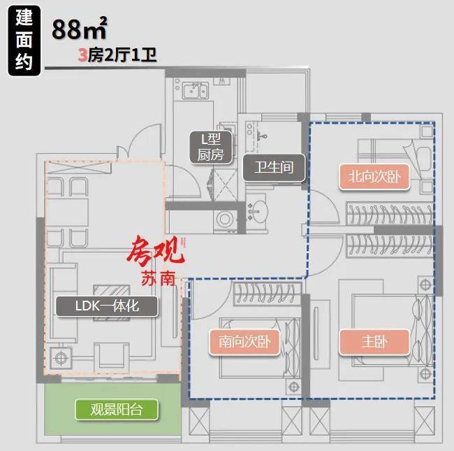 项目约88㎡户型,整个户型都采用LDK一体化设计,大横厅+餐厅“洄游动线”的设计,解决了传统户型的过道浪费和进深短问题,大大提高了面积利用。