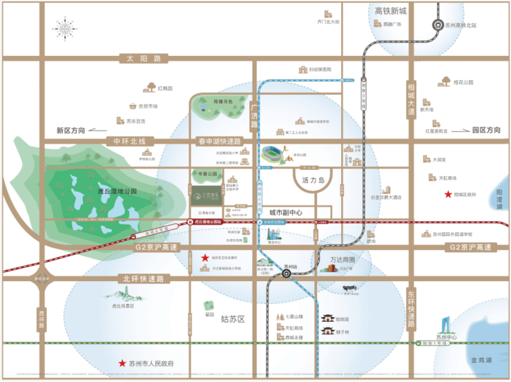 项目是苏州难得的双地铁盘,4号线和8号线均已通车运行。而且主城内最大的湿地公园——虎丘湿地公园就在旁边,生态优越,平时跑步、露营、放风都是极好的去处。