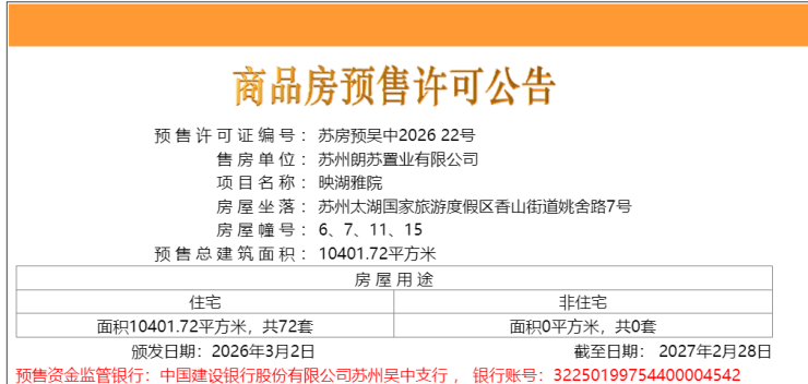 在时隔半年多之后,吴中区环太湖板块的 太湖朗墅 (备案名:映湖雅院)首批次房源取证了。