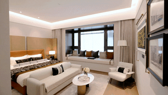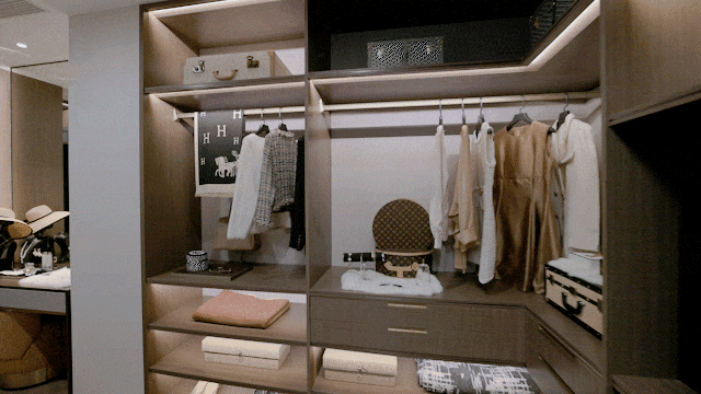 约55㎡豪华全套房主卧,除了放一张超大双人床,还能安排上男女双衣帽间、带双台盆的独卫,在功能方面直接多了一个level,关上房门就是主人的“小世界”。