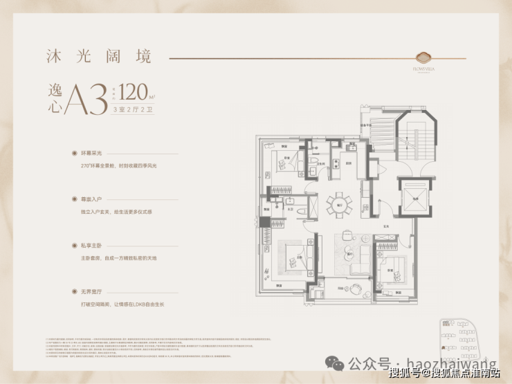 另外还有约120㎡的3房户型,全屋飘窗赠送(实得率超82%)+类一梯一户(4#、6#楼配置)+270°双卧转角窗(边套户型)+飞机户型南北通透+约10.8-11.2米大面宽三开间朝南,尺度感拉满,而且设备平台精心设计,不遮挡北侧视线。