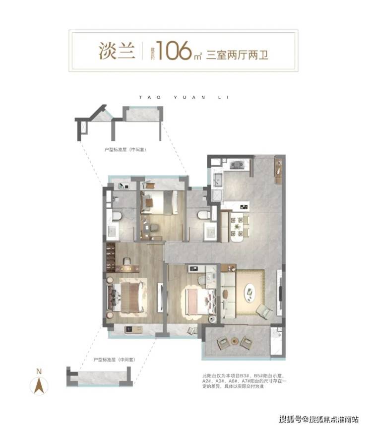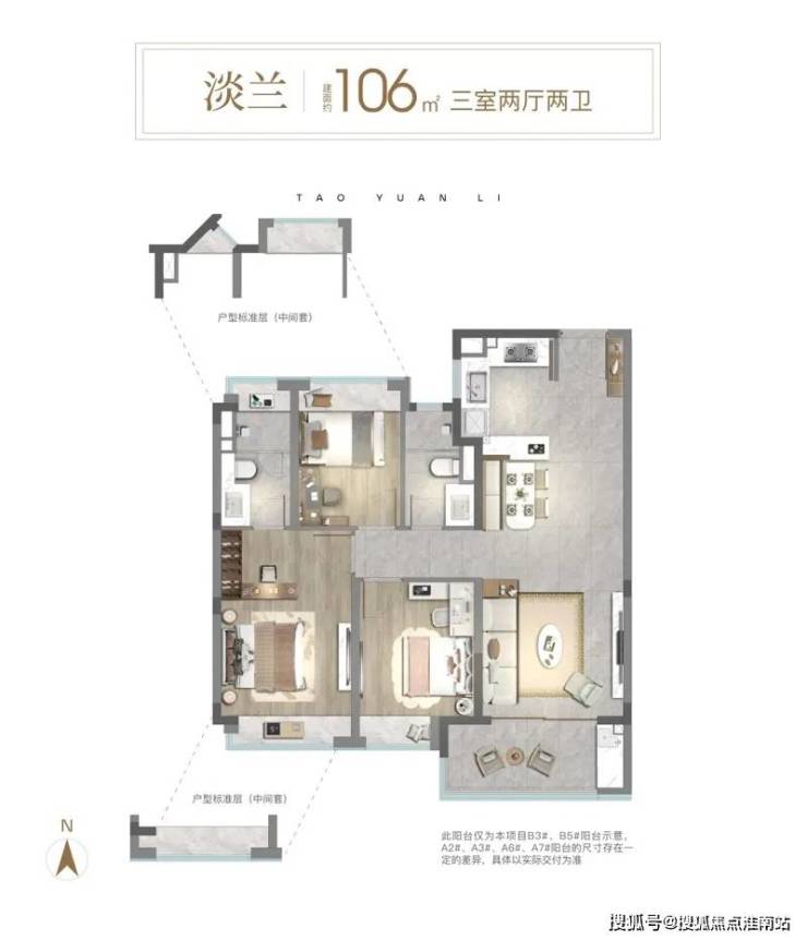 建面约106㎡,得房率高达约78%,做到了真正的正三房空间 ,客厅面宽达到 约3.45米 ,开放式可视厨房设计,搭配南向大面积阳台,打造开阔的一体化家庭公共活动空间,整体居住体验明亮开阔。