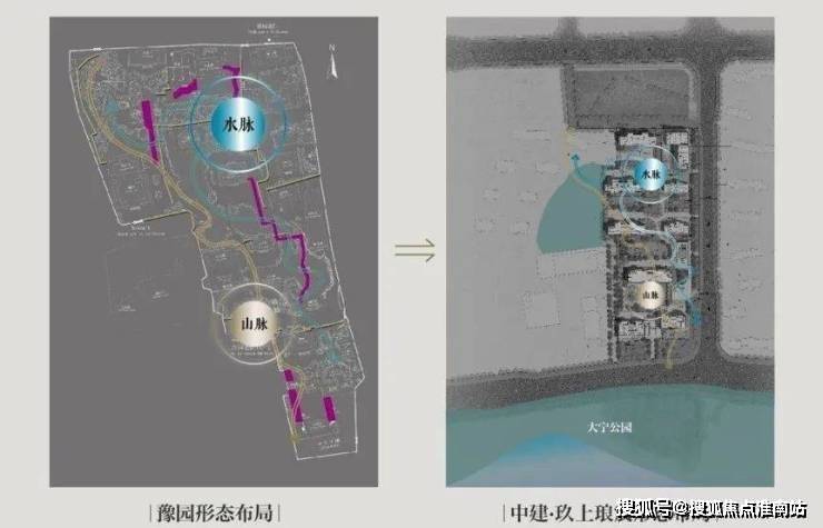 「中建·玖上琅宸」的景观灵感也同样来自豫园。整个中轴线的动线源自豫园“山脉+水脉”的布置手法,景观蜿蜒曲折,遍布下沉庭院、绿植、叠瀑和水景,未来呈现会非常震撼。