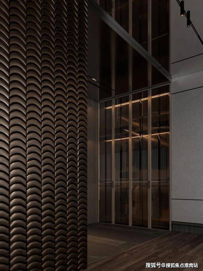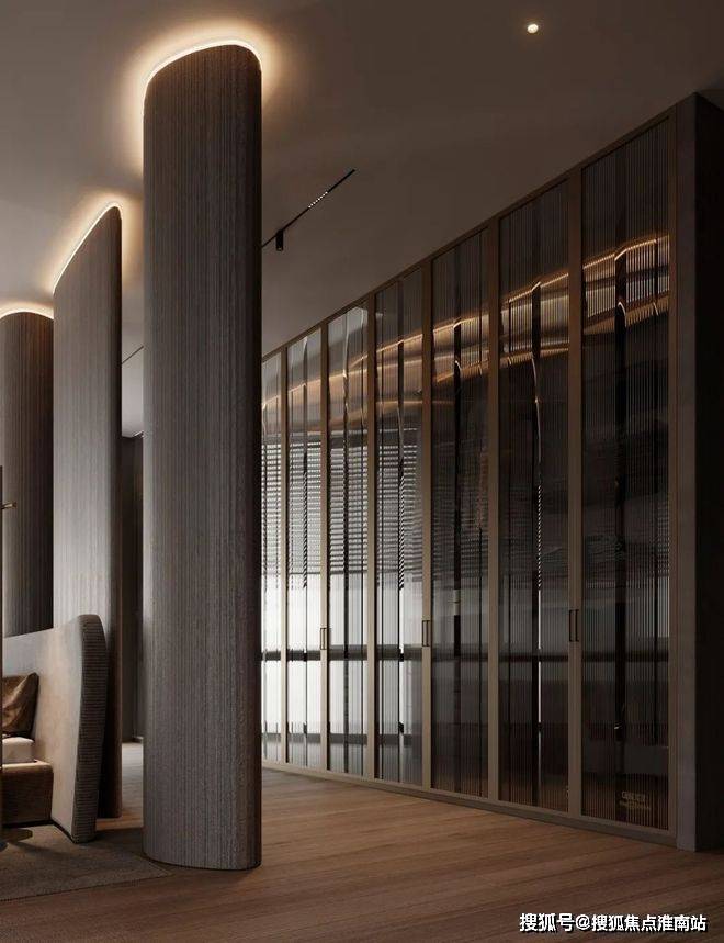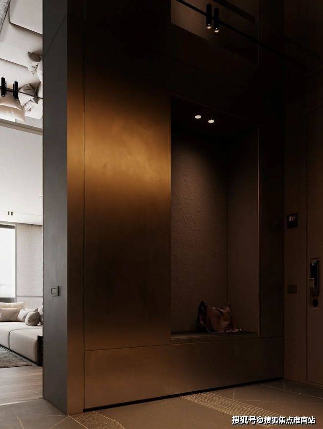 深色的玄关加上深灰色的墙面,让整个空间变得神秘又迷人。暗黄色的灯光给整个空间带来一丝神秘,客厅的视野完全被落地窗全部打开,整个空间显得通透大气。