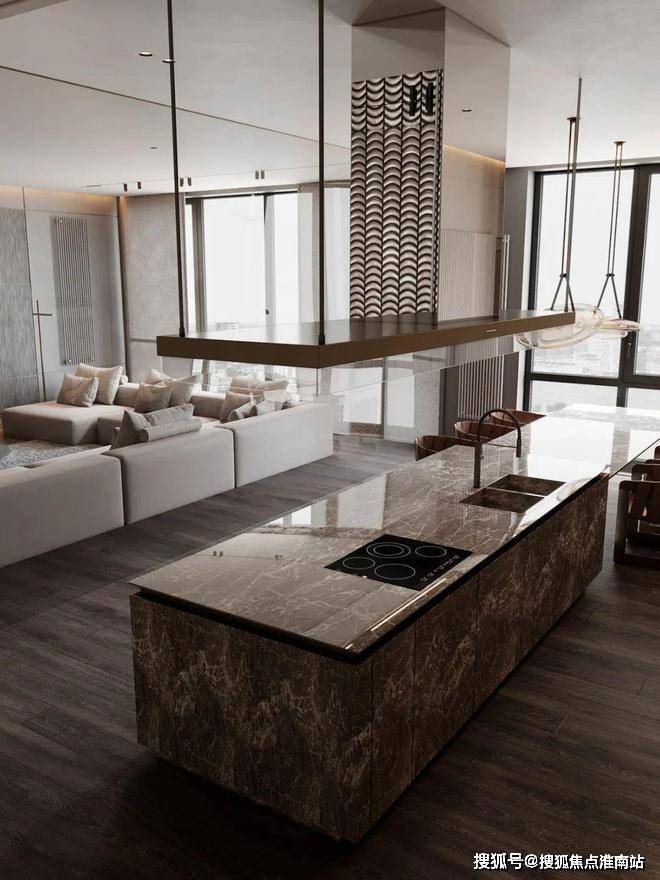 整个餐厅的墙壁和天花板全部使用可视镜作为装饰,把客厅和餐厅的风景全部融合在一起,餐厅的餐桌和大理石岛台完全烘托出现代的氛围感。