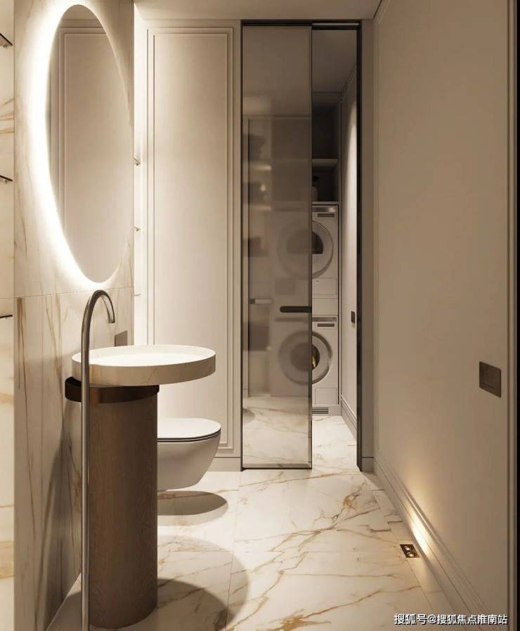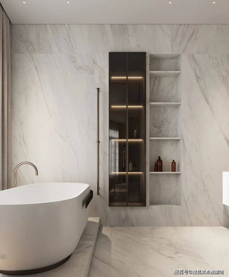 The bathroom expresses the cleanliness of the space through bright light, and the white marble sets off the cleanness and purity of the space, showing a sense of high quality.