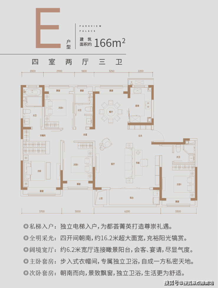建面约166㎡奢境户型,南向四开间面宽可达约16.2m,约6.2米宽厅连接宽幕阳台,突破性尺度设计,带来通透的全景视野,一眼望向城市自然与繁华,居住于此,大平层的尊崇奢居体验油然而生。