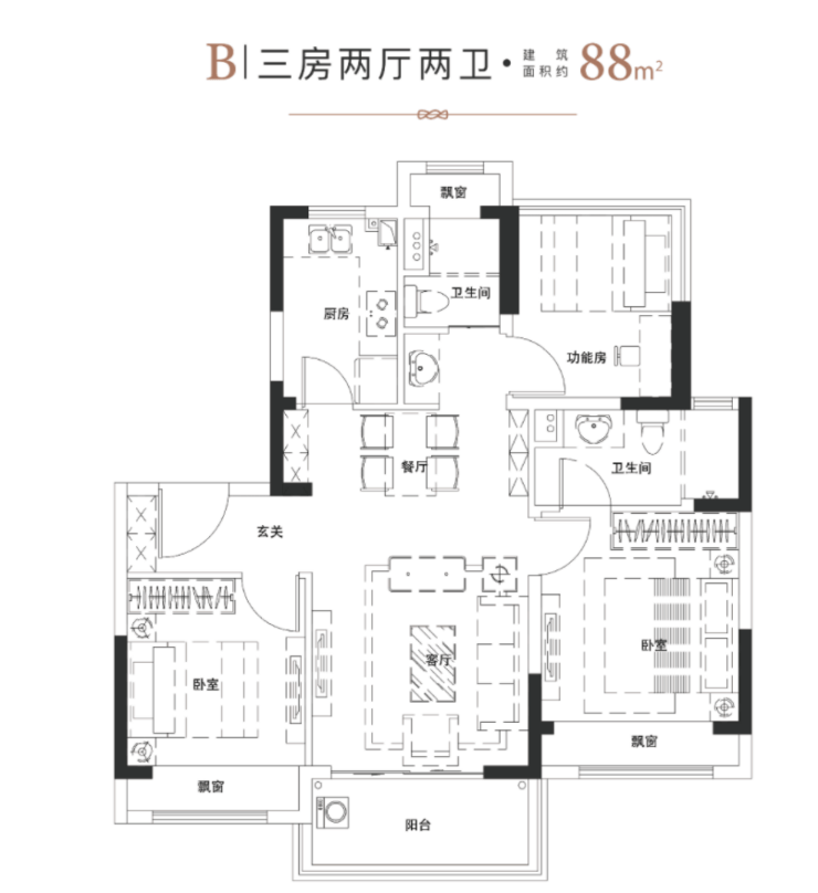 建筑面积:88平米(三房两厅两卫)