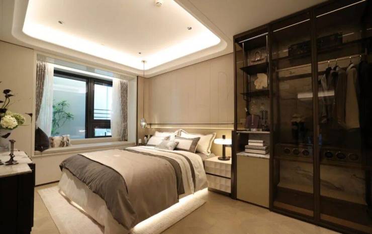 再来看看134㎡3室2厅2卫样板房。比起112㎡户型,这个客厅要宽敞很多,岛台也可以做成独立样式,摆放6人长桌也绰绰有余。主卧采用270度拐角飘窗设计,采光面拉满。